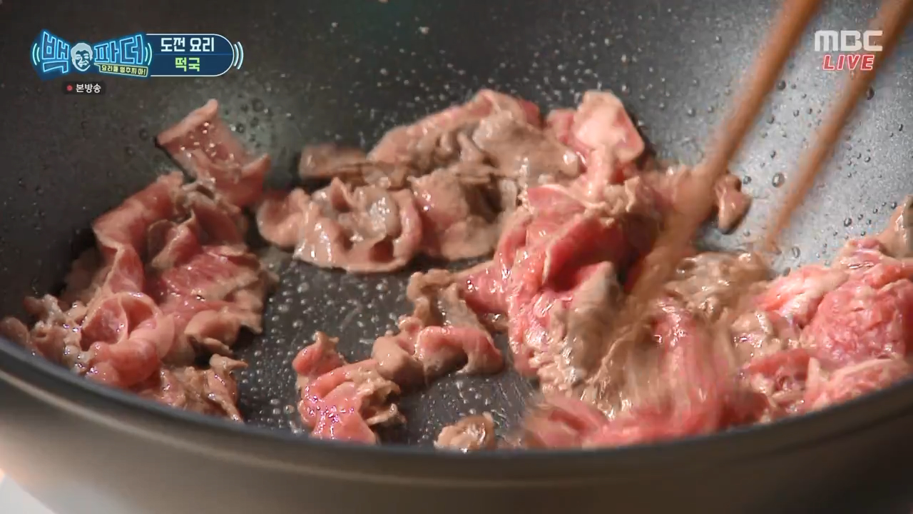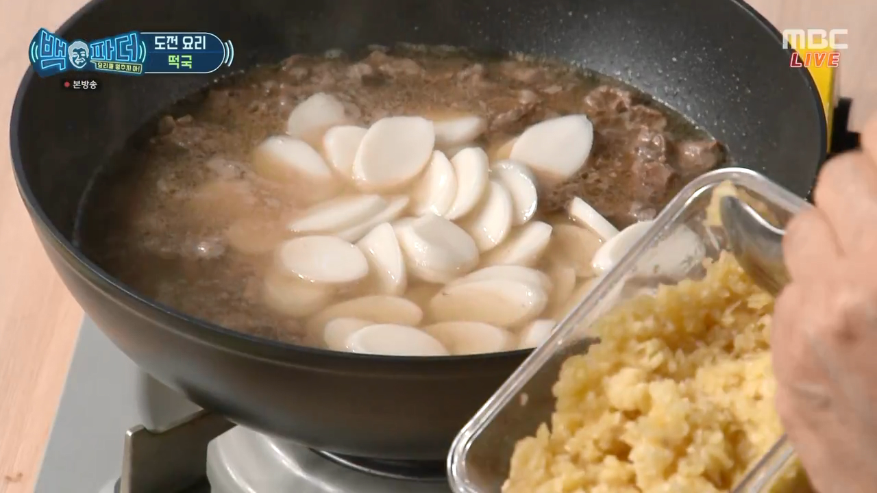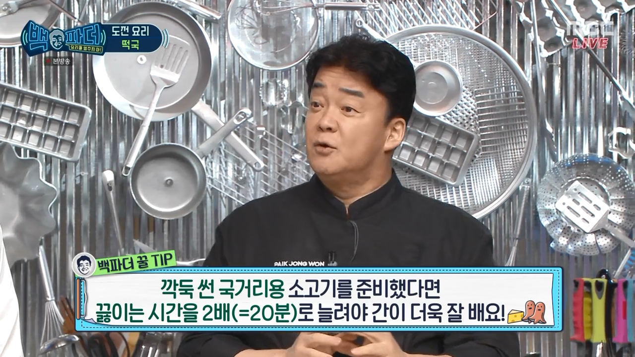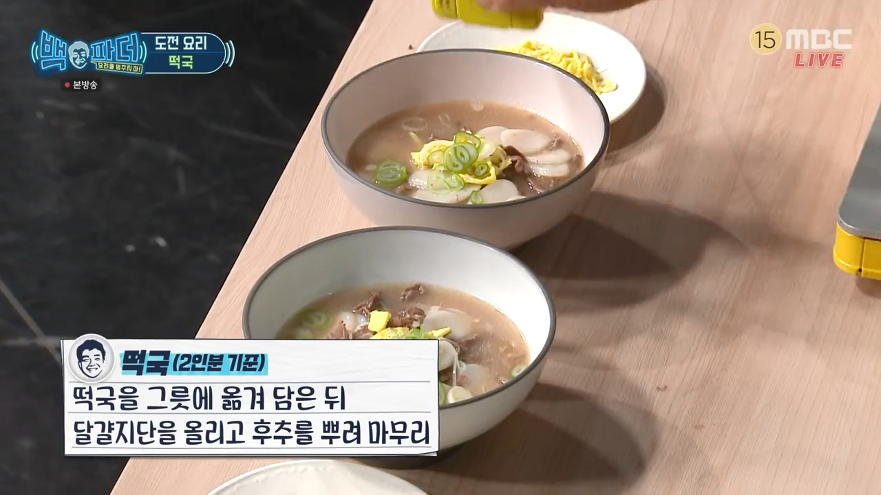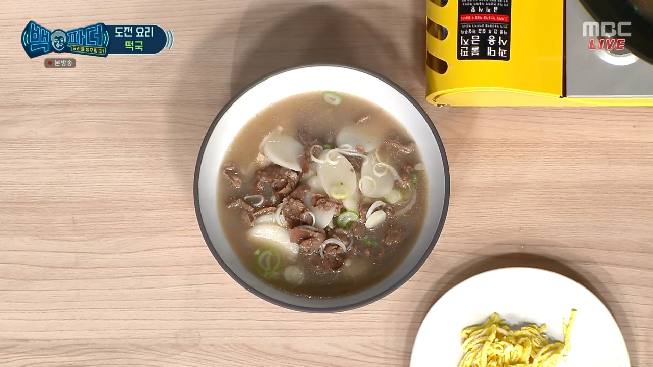방송에서는 고기 국물 내는 시간 동안 지단 만들기 보여주는 동안 너무 졸아서 물을 좀 더 넣었는데 실제로 끓일 때는 10분 정도 끓인 후에 물 3컵을 붓고 강불로 끓이기만 하면 마무리된다고 합니다.